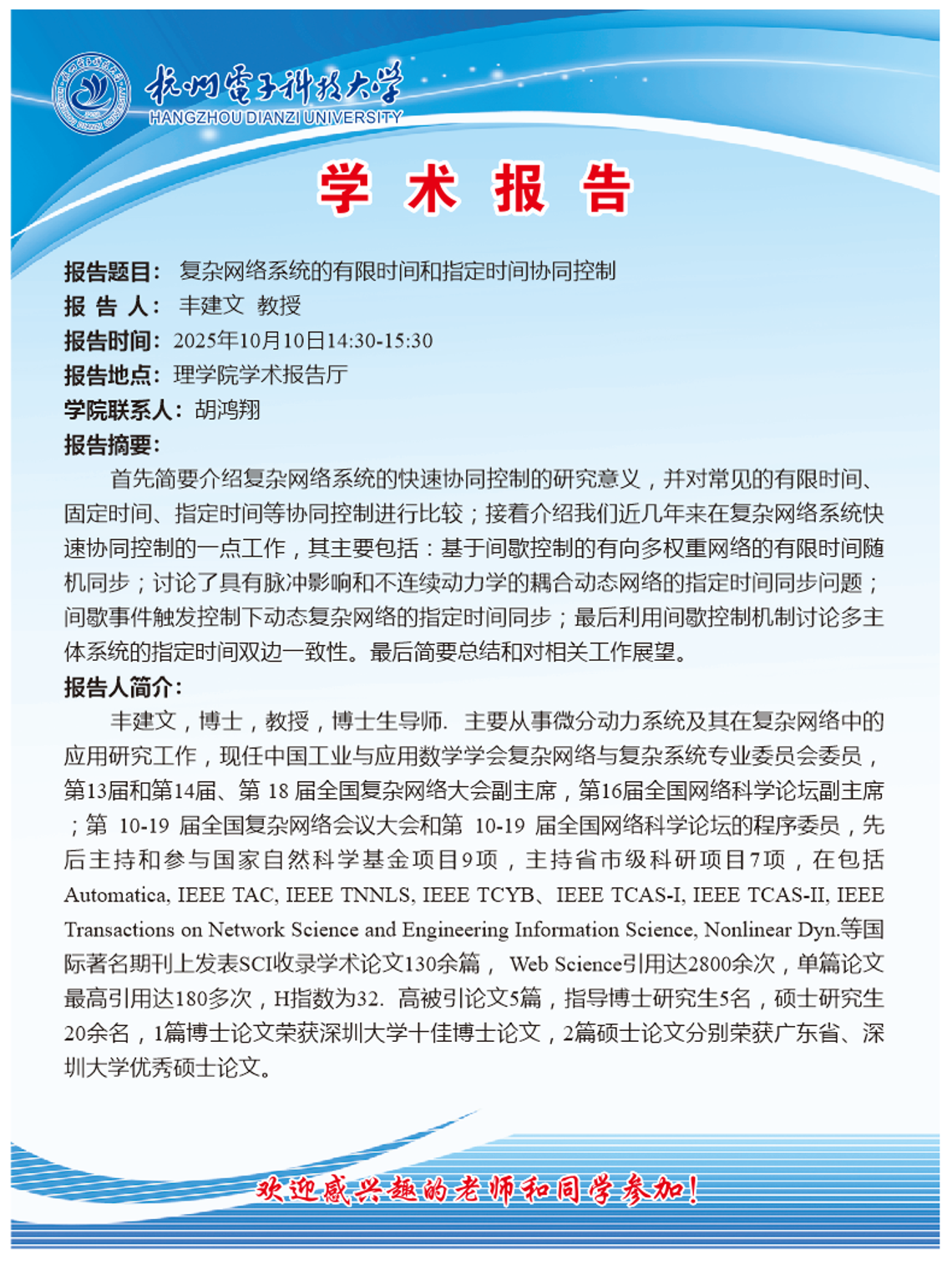 丰建文,博士,教授,博士生导师. 主要从事微分动力系统及其在复杂网络中的应用研究工作,现任中国工业与应用数学学会复杂网络与复杂系统专业委员会委员,第13届和第14届、第 18 届全国复杂网络大会副主席,第16届全国网络科学论坛副主席;第 10-19 届全国复杂网络会议大会和第 10-19 届全国网络科学论坛的程序委员,先后主持和参与国家自然科学基金项目9项,主持省市级科研项目7项,在包括Automatica,IEEE TAC, IEEE TNNLS, IEEE TCYB、IEEE TCAS-I, IEEE TCAS-II, IEEE Transactions on Network Science and Engineering Information Science, Nonlinear Dyn.等国际著名期刊上发表SCI收录学术论文130余篇, Web Science引用达2800余次,单篇论文最高引用达180多次,H指数为32. 高被引论文5篇,指导博士研究生5名,硕士研究生20余名,1篇博士论文荣获深圳大学十佳博士论文,2篇硕士论文分别荣获广东省、深圳大学优秀硕士论文。