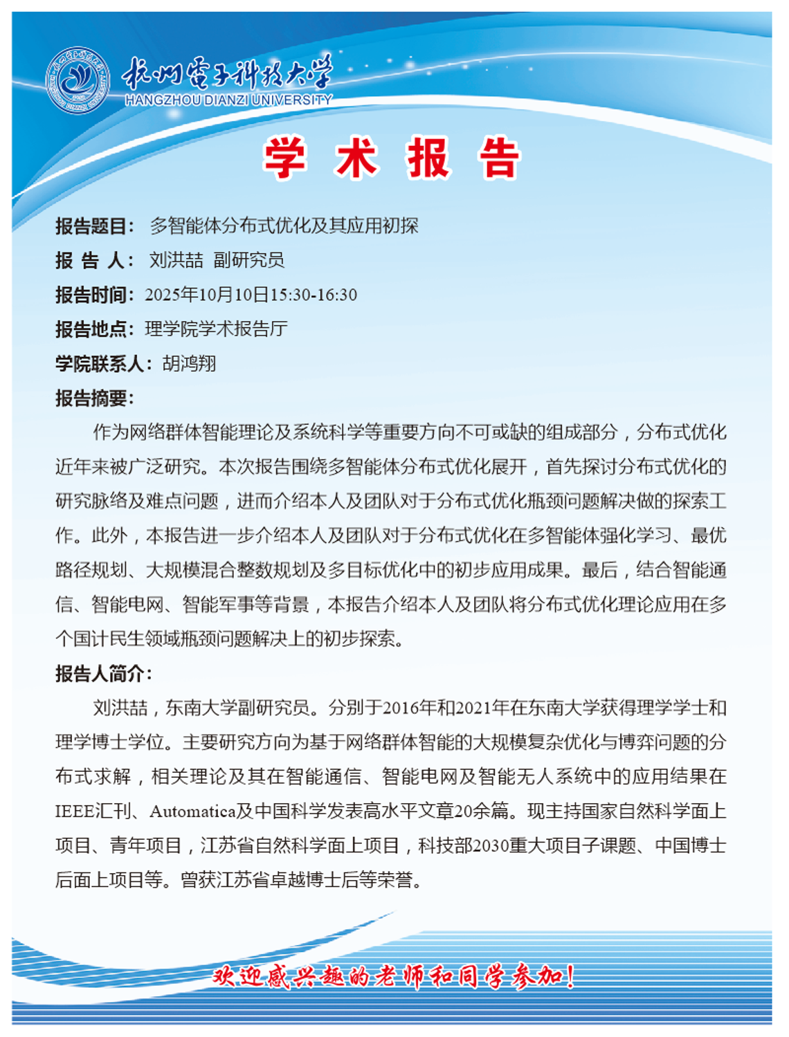 刘洪喆,东南大学副研究员。分别于2016年和2021年在东南大学获得理学学士和理学博士学位。主要研究方向为基于网络群体智能的大规模复杂优化与博弈问题的分布式求解,相关理论及其在智能通信、智能电网及智能无人系统中的应用结果在IEEE汇刊、Automatica及中国科学发表高水平文章20余篇。现主持国家自然科学面上项目、青年项目,江苏省自然科学面上项目,科技部2030重大项目子课题、中国博士后面上项目等。曾获江苏省卓越博士后等荣誉。