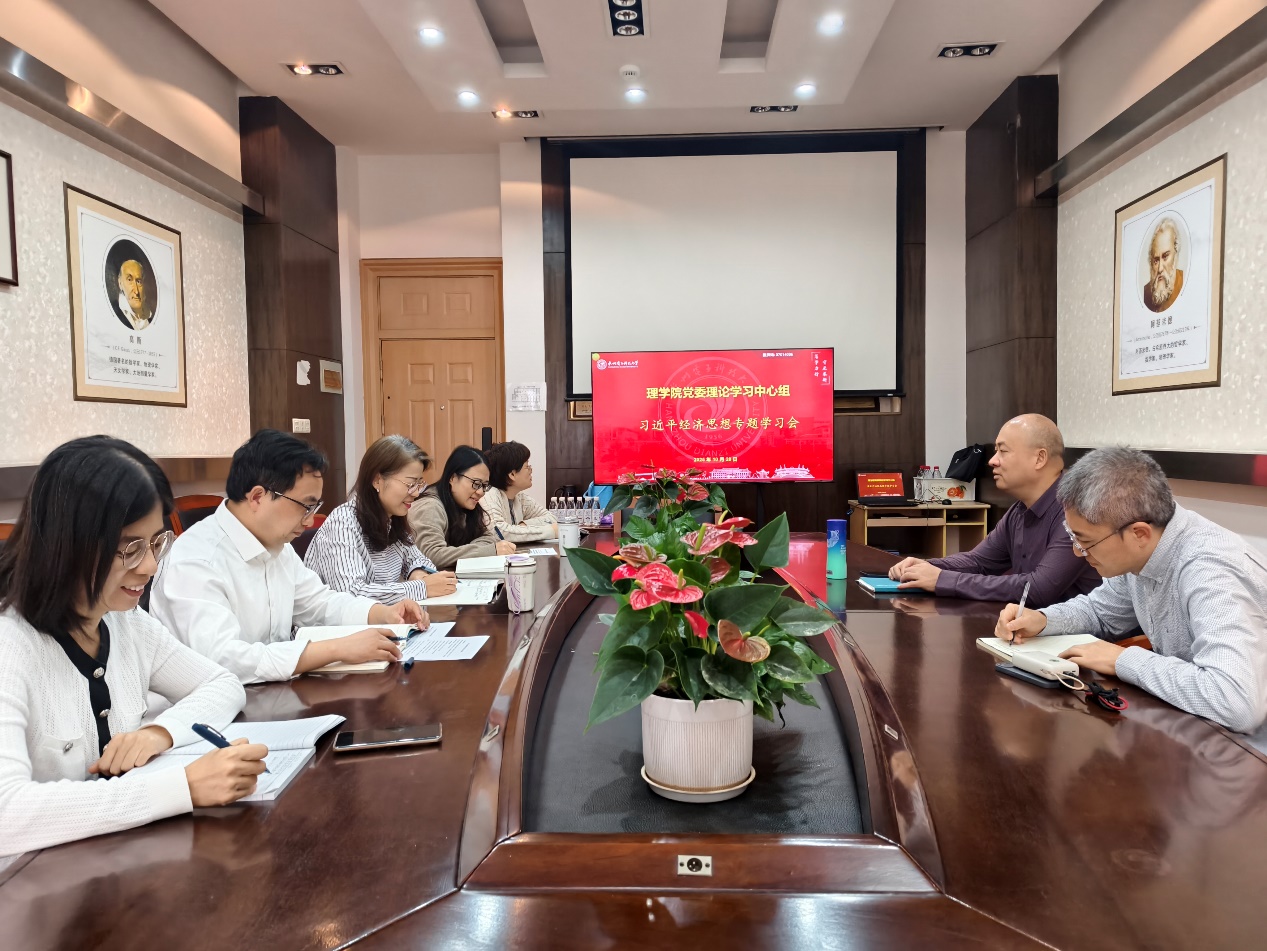10月28日下午,理学院党委理论学习中心组在6教南432会议室举行“习近平经济思想”专题学习会。学院党委书记吴一桥,院长邓重阳,党委副书记兼纪委书记孟金环,副院长李源、王阳,党委委员覃森等参加会议,吴一桥作主题发言。