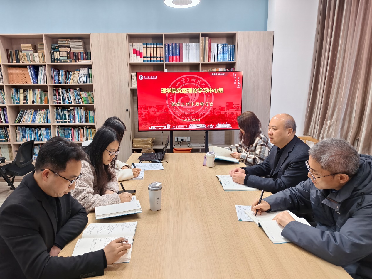12月3日下午,理学院党委理论学习中心组在6教南426“人才之家”举行保密工作专题学习会。学院党委书记吴一桥,院长邓重阳,党委副书记兼纪委书记孟金环,副院长李源、王阳,党委委员覃森等参加会议,邓重阳作主题发言。